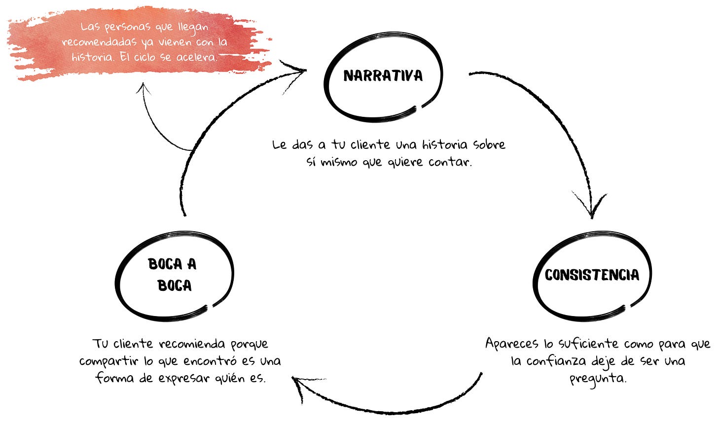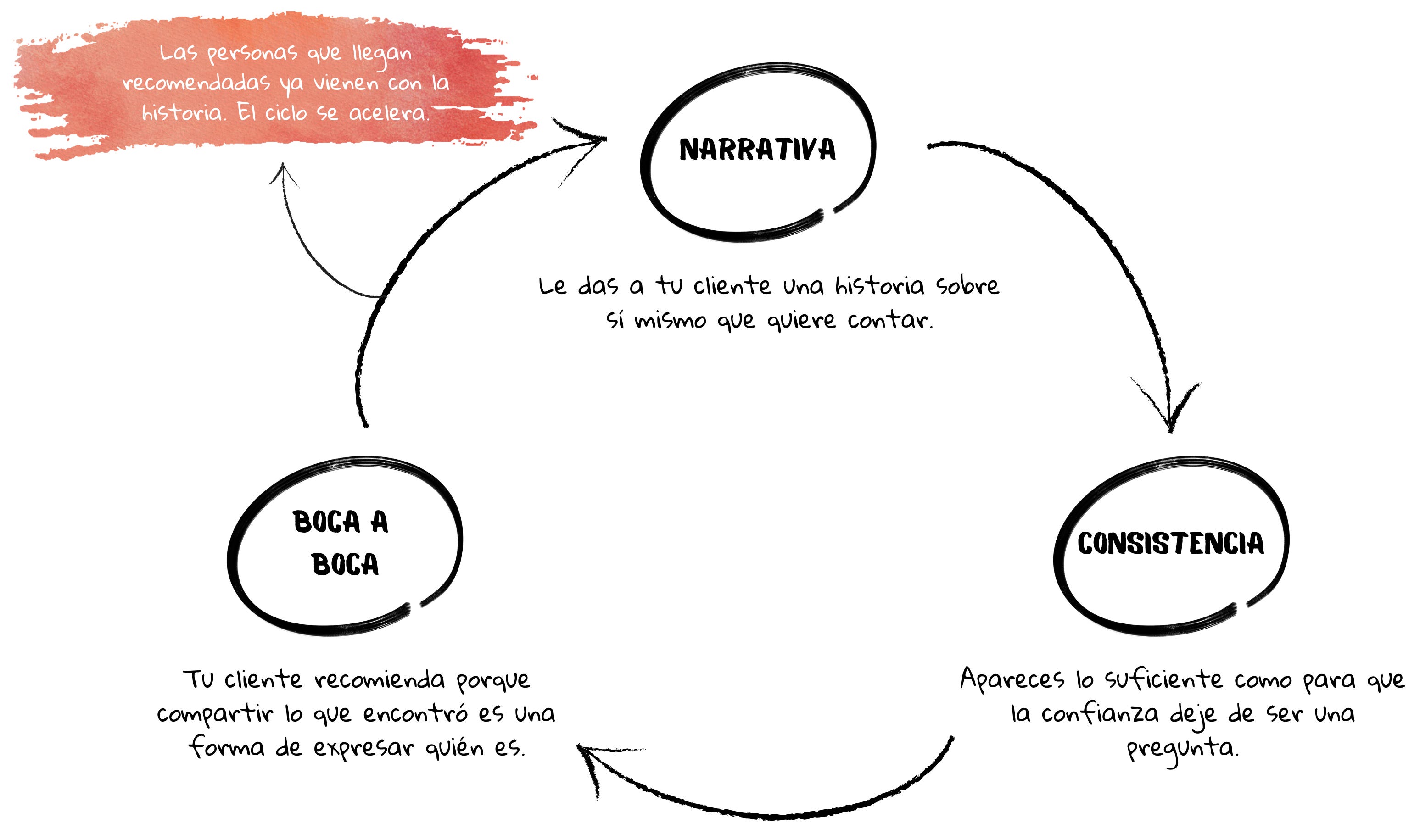 Cuando esos tres elementos están en su lugar, la recomendación no es un favor que le pides a tu cliente. Es algo que tu cliente necesita hacer. Porque recomendar algo que amas es una forma de decir «esto es lo que me importa». Es un acto de identidad, no de generosidad.